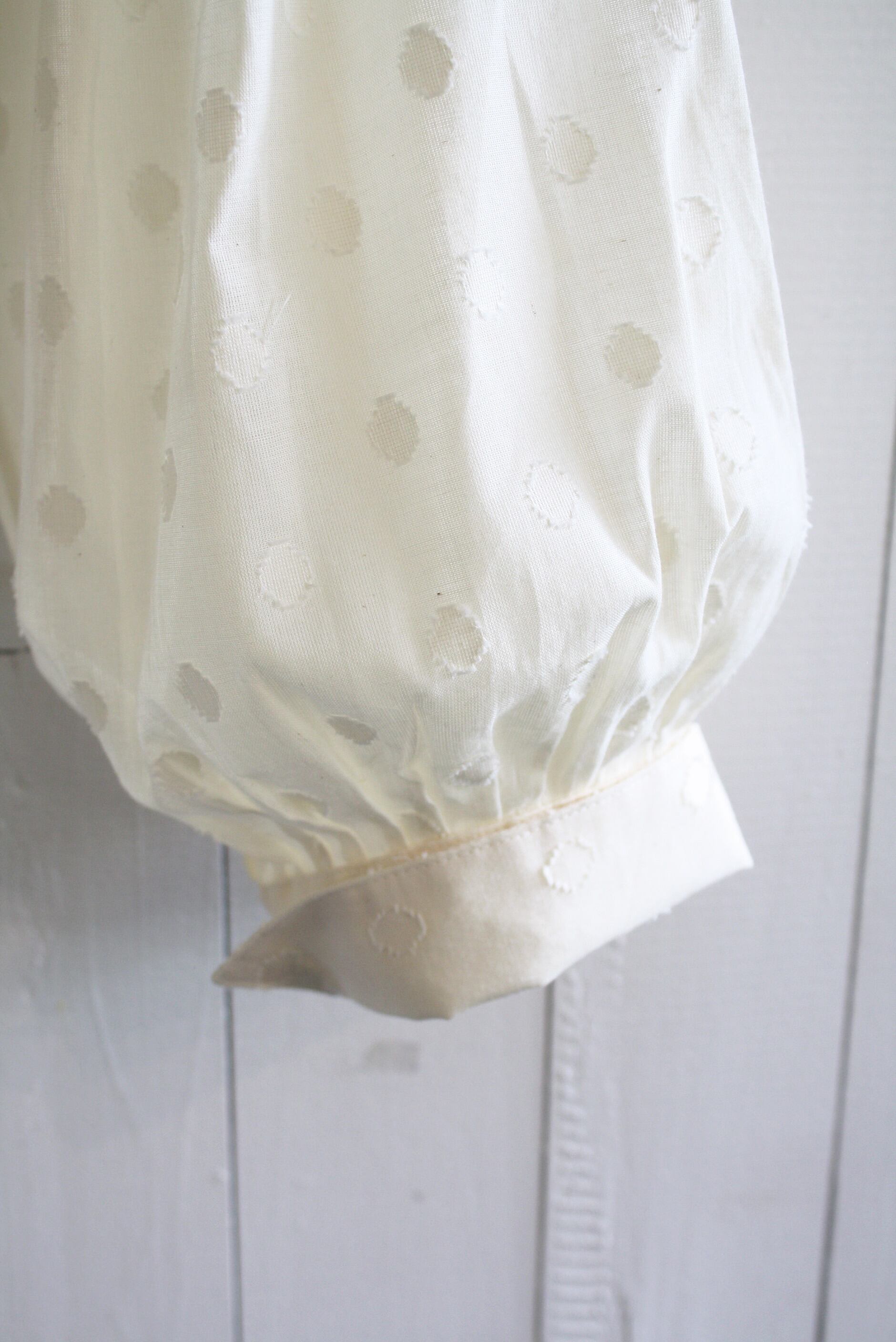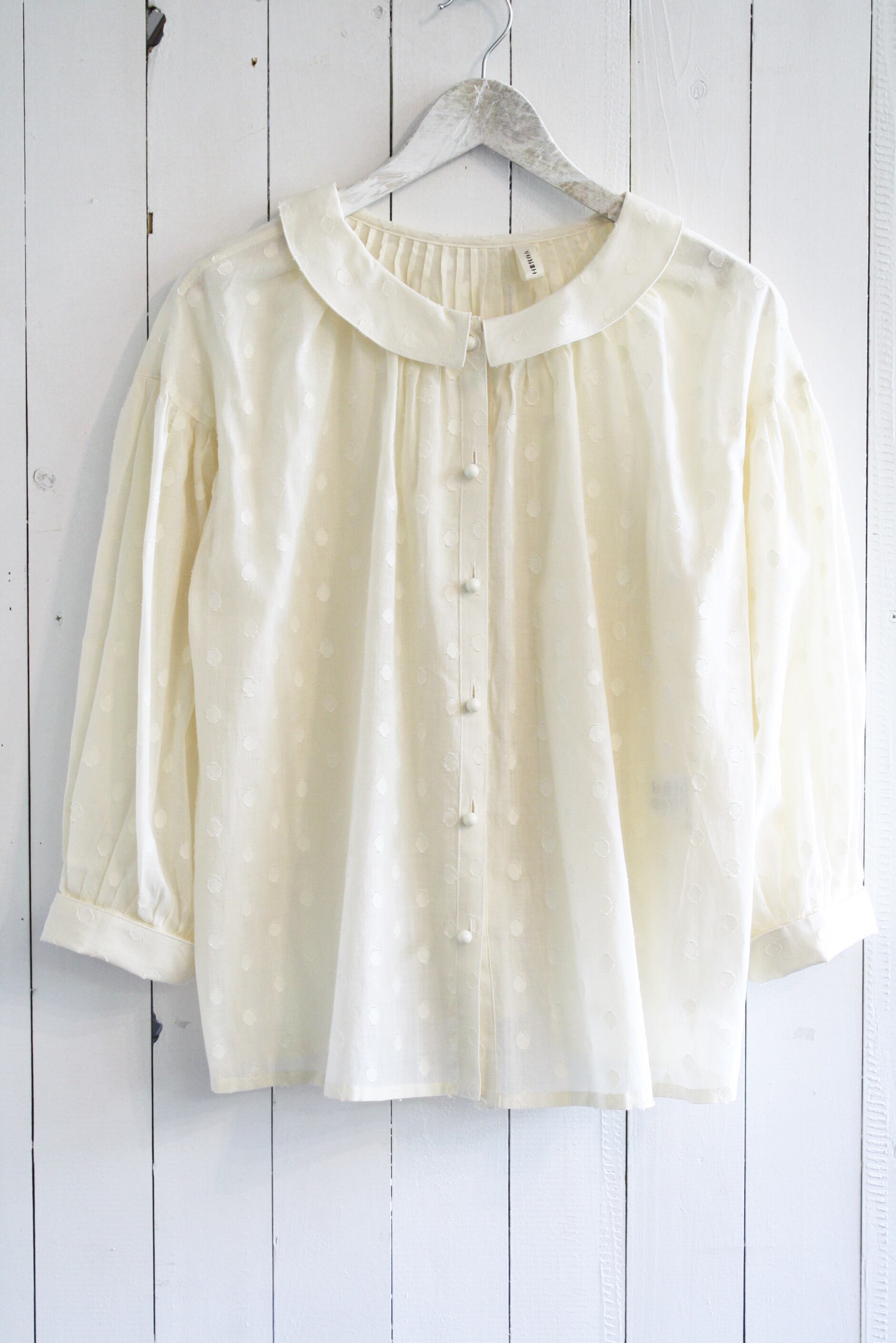 首元と、袖口に細かくとられたタック、ふんわりとしたAラインのシルエットにラウンドカラーで、ノスタルジックでロマンティックな印象です。