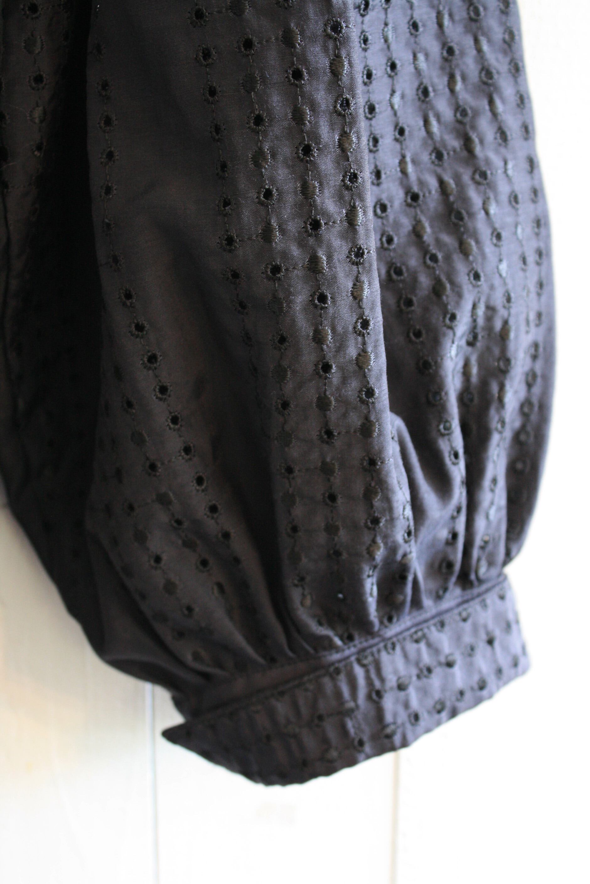 首元と、袖口に細かくとられたタック、ふんわりとしたAラインのシルエットにラウンドカラーで、ノスタルジックでロマンティックな印象です。